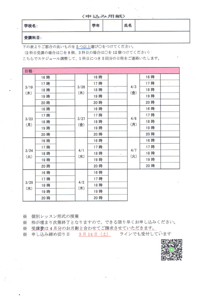 今回の春期講習は、**個別レッスン形式(60分×3回)**で行います。