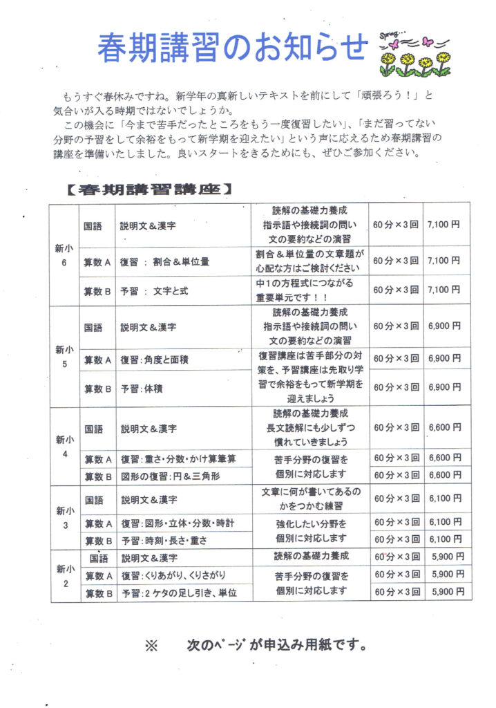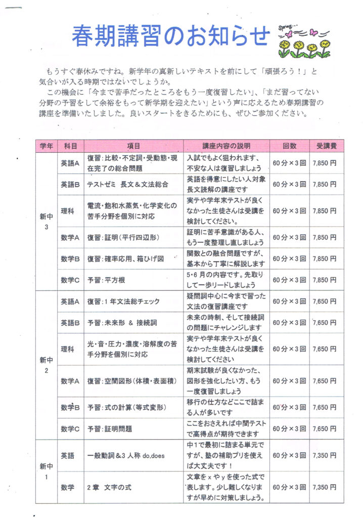 そこで当塾では、新学年に向けた春期講習を実施いたします。