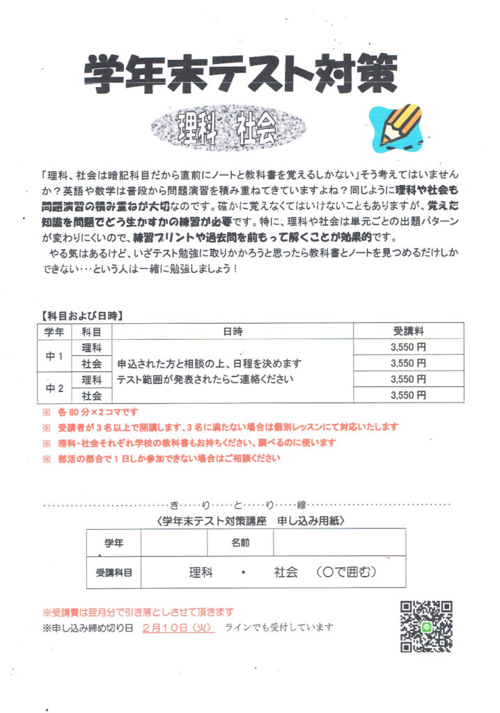 2月18日から始まる期末 理科・社会のテスト対策の案内です。 3学期は内容が難しく、範囲も広いです。