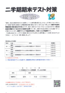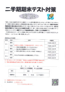 さて、西宮の瓦木中、甲武中、深津中は11月10日から、尼崎の中央中、日新中、大庄中は11月17日から期末試験が行われます。 普段の授業では英語・数学を中心に個別指導を行っていますが試験前は理科・社会もリクエストに応じて対策します、不安な方はご参加ください。